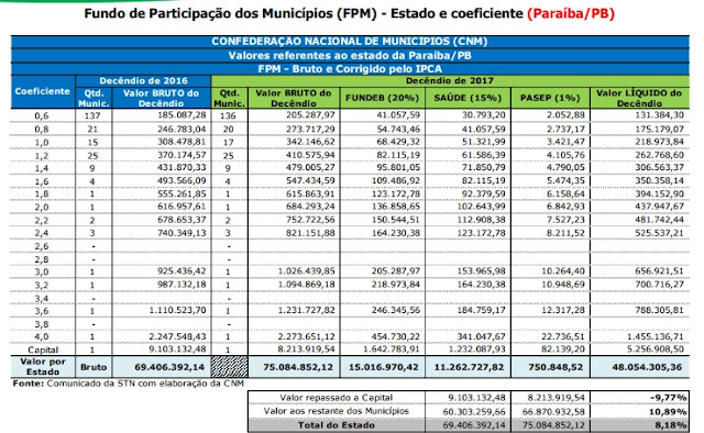 Os municípios da Paraíba irão receber na próxima sexta-feira (29) o valor bruto de R$ 75.084.852,12. Subtraindo os valores do Fundo Nacional de Desenvolvimento da Educação Básica (Fundeb), da Saúde e do Programa de Formação do Patrimônio do Servidor Público (Pasep), o valor líquido fica em R$ 48.054.305,36.