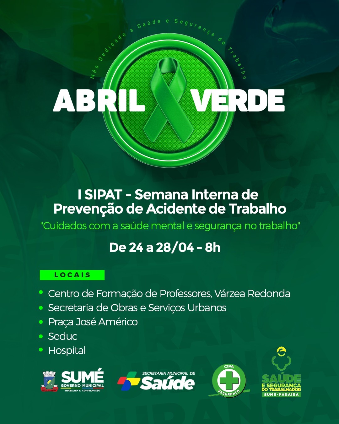O evento faz parte da programação do “Abril Verde”, uma iniciativa que busca conscientizar a população sobre a importância da saúde e segurança no trabalho. O movimento surgiu como uma forma de lembrar o Dia Mundial em Memória às Vítimas de Acidentes e Doenças Relacionadas ao Trabalho, que é celebrado no dia 28 de abril.