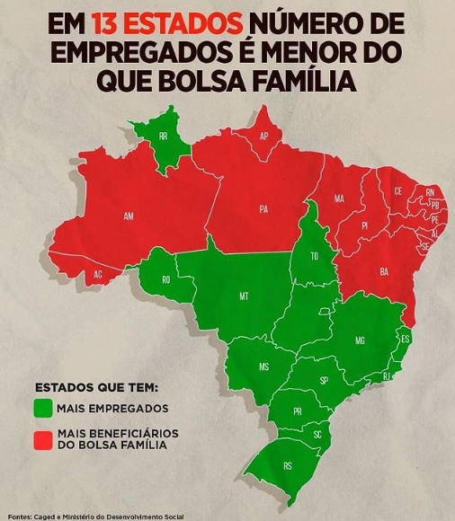 O ClickPB observou que a maior diferença está na Bahia, onde 2.646.130 de pessoas recebem Bolsa Família, contra 1.913.221 pessoas empregadas com carteira assinada.