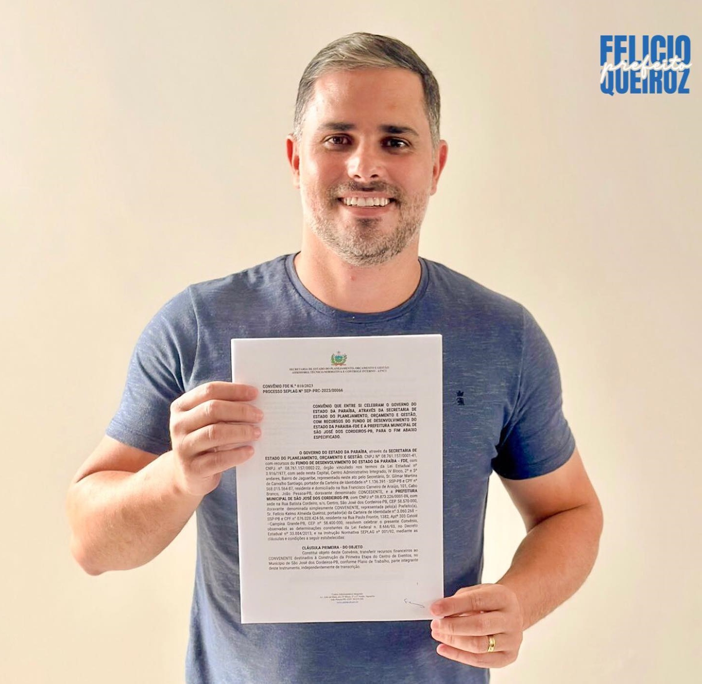O Prefeito de São José dos Cordeiros, Felicio Queiroz, assinou hoje (05/05), o convênio com o Governo do Estado que garante o aporte de recursos de R$ 1.500.040,71 para construção do Centro de Eventos, no município.