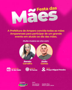 A Prefeitura de Amparo promove nessa sexta-feira (12) um grande evento em alusão ao Dia das Mães. O evento acontecerá na Praça Miguel Pereira a partir das 19 horas.