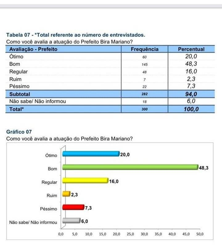 Outro destaque é para o baixo índice de rejeição que somou apenas 9.6%, somados os índices de ruim e péssimo. O resultado é um reflexo das ações e projetos desenvolvidos pela gestão de Bira Mariano em benefício da população do município.