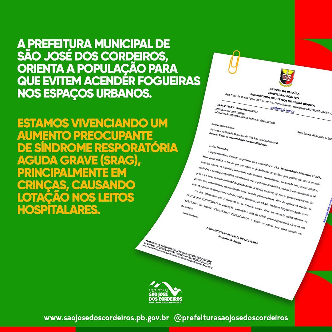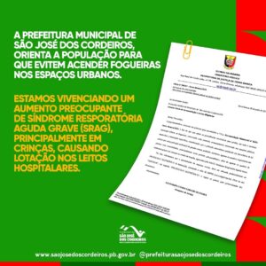 Com base nesses fatos, a Prefeitura Municipal de São José dos Cordeiros orienta a população para que evitem acender fogueiras nos espaços urbanos, assim, colaborando de forma efetiva com a decisão do Ministério Público.