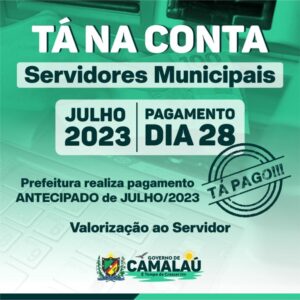 Nesta sexta-feira (28), o prefeito de Camalaú, Bira Mariano, anunciou o pagamento dos servidores públicos do município. Com comprometimento e esforço da gestão municipal, o pagamento referente ao mês de julho foi antecipado.