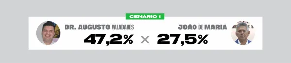 Quando o candidato governista é o prefeito de Ouro Velho, Augusto Valadares, ele tem 47,2%, contra 27,5% do ex-presidente da Câmara, João de Maria. Augusto cresceu 5,7% em relação ao levantamento anterior, de março. E João de Maria caiu 4%. Branco, nulo ou nenhum somam 12,5%. Não sabem e indecisos, 12,8%.