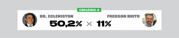 O empresário Fredson Brito também foi incluído nas simulações. Quando o governista a ser enfrentado é Eclérinston Ramos, o vice tem 50,2% contra 11% de Fredson. No levantamento anterior, de março, Eclérinston tinha 56,6% contra 13,3%. A queda se explica pelo aumento dos que se declararam votantes em branco, nulo ou nenhum, 24,5%. Eram 14,3%. Os que se dizem indecisos ou não sabem são 14,3%. Eram 15,8%.