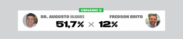 Quando a disputa é entre Augusto Valadares e Fredson Brito, o prefeito de Ouro Velho tem 51,7%, contra 12% do empresário da Perfil Empreendimentos. Curiosamente o quadro apresenta estabilidade em relação a março, quando os percentuais foram de 49,4% x 12% . Branco, nulo ou nenhum chegam a 21,5% e indcisos ou não sabem, 14,8%.
