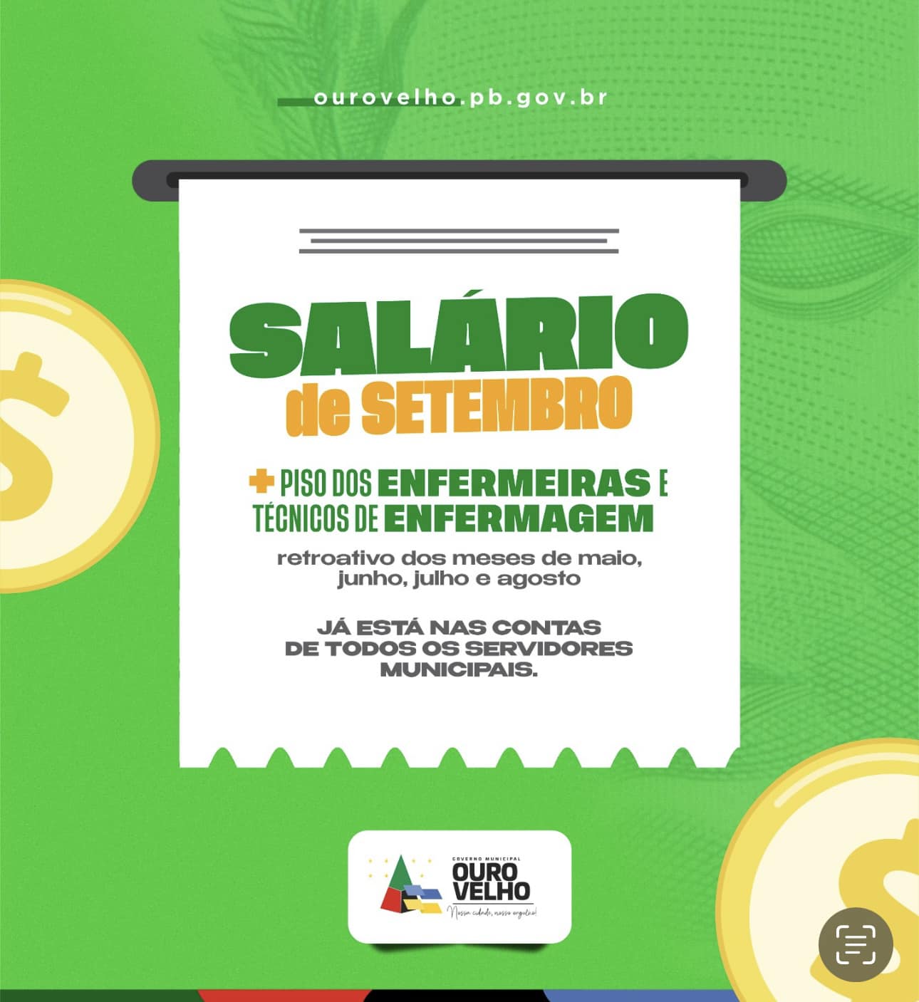 A Prefeitura Municipal Ouro Velho, através do prefeito Dr. Augusto Valadares, anunciou nesta terça-feira, dia 19, a liberação da folha salarial dos servidores municipais referente ao mês de setembro e o pagamento do novo piso da enfermagem retroativo de maio até agora.