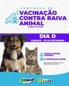 A Campanha de Vacinação contra a Raiva para Cães e Gatos no município de Amparo terá início com o dia “D” da campanha, que acontecerá no próximo sábado, 23 de setembro. A vacinação acontecerá na Praça Miguel Pereira a partir das 08hrs da manhã.