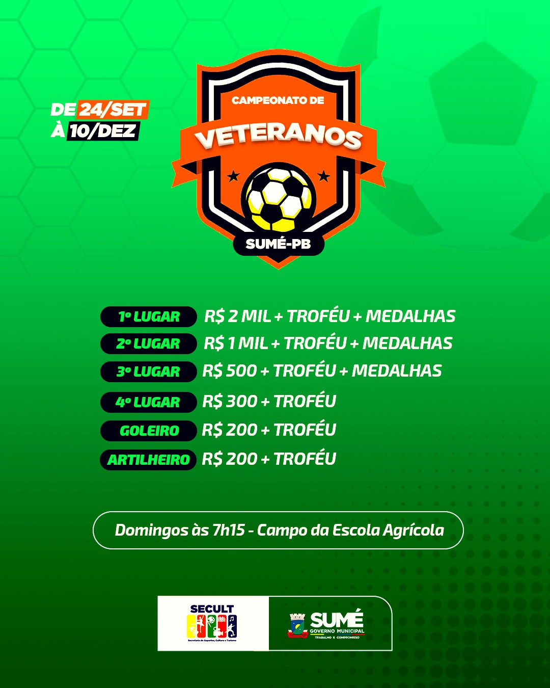 A Prefeitura de Sumé, por meio da Secretaria de Cultura, Esportes e Turismo, vai realizar de 24 de setembro à 17 de dezembro, o Campeonato Sumeense de Veteranos (a partir de 40 anos), edição 2023.