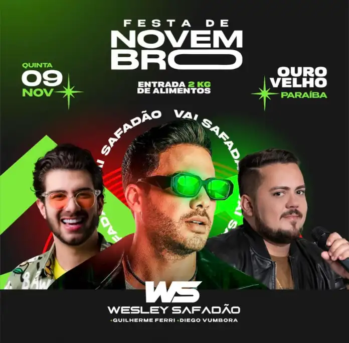 Além de Wesley Safadão, a Festa de Novembro de Ouro Velho contará com shows de Guilherme Ferri e Diego Vumbora. Os shows começam as 21h, com Diego Vumbora, as 23hs sobe ao palco Wesley Safadão, encerrando com Guilherme Ferri.