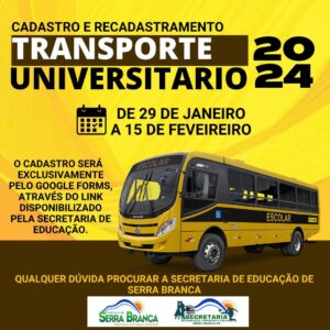 A Secretaria de Educação, Esporte e Lazer, começou no último dia 29 de janeiro, a realizar o recadastramento e atualização de dados, dos estudantes que irão fazer uso do transporte universitário em 2024.