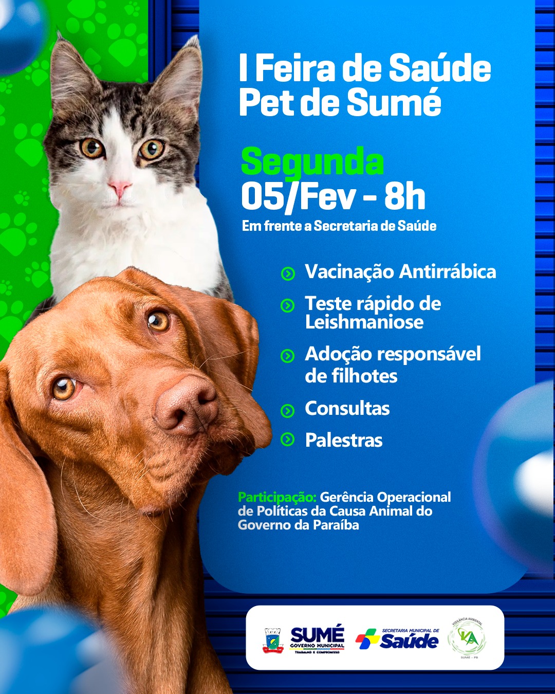A Prefeitura de Sumé por meio da Secretaria de Saúde/Vigilância Ambiental, promoverá, nessa segunda-feira, 05, a sua I Feira de Saúde Pet, dedicada a cães e gatos.
