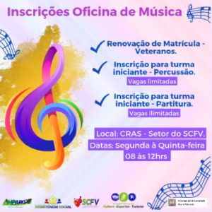 A Prefeitura de Amparo através das Secretarias Municipais de Assistência Social e de Cultura, Esporte e Turismo abriu as inscrições para as oficinas de música.