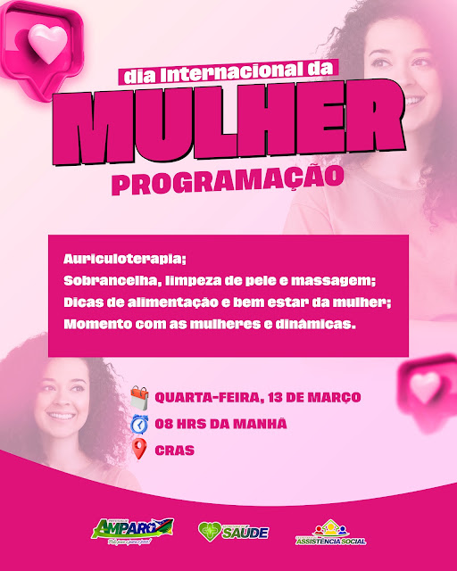 A Prefeitura de Amparo, através das Secretarias Municipais de Saúde e Assistência Social estará promovendo nessa quarta-feira (13/03) um evento alusivo ao Dia Internacional da Mulher.