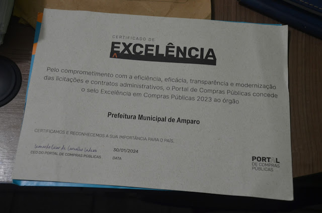 A Prefeitura de Amparo recebeu o Certificado de Excelência em Compras Públicas, concedido pelo Portal de Compras Públicas, pelo comprometimento com a eficiência, eficácia, transparência e modernização das licitações e contratos administrativos no ano de 2023.