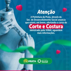 A Prefeitura da Prata, por meio da Secretaria de Desenvolvimento Social, tem o prazer de anunciar uma nova oportunidade de capacitação para os moradores do município. Em breve, estará disponível o curso de Corte e Costura, ministrado em parceria com o SENAI.