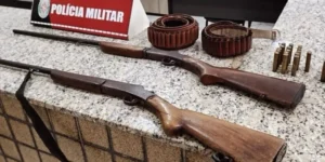 Com ele foram encontradas duas espingardas, uma de calibre 32, a outra de calibre 36, além de 29 munições.