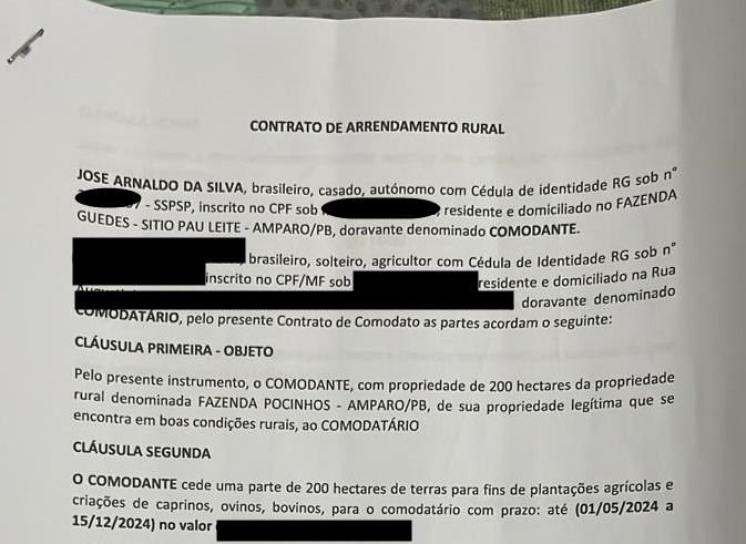 De acordo com o documento, o COMODATÁRIO, é agricultor, natural do Estado de Pernambuco, e o terreno deveria ser utilizado para fins de plantações agrícolas e para a criação de caprinos, ovinos e bovinos.
