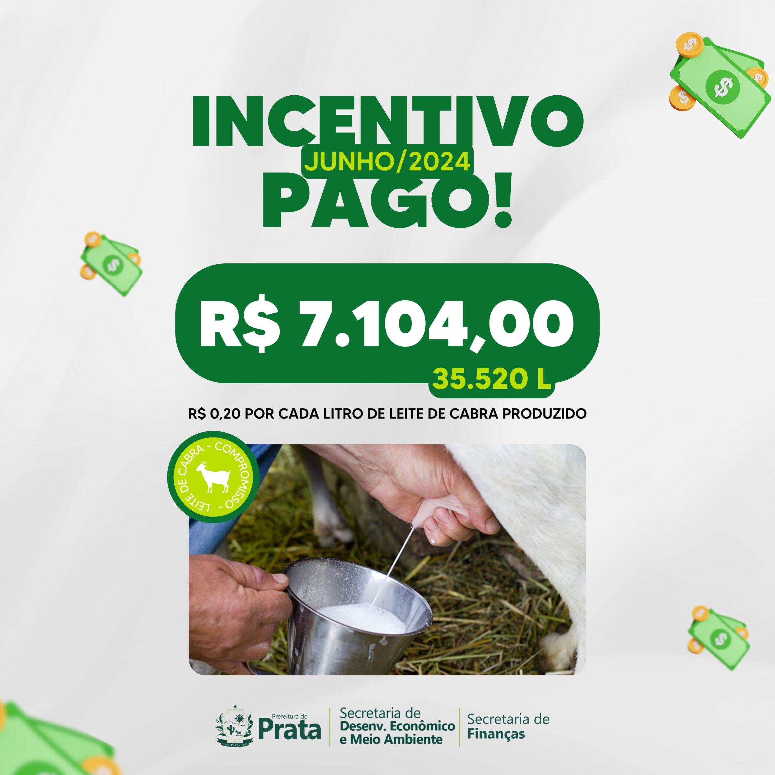 A Prefeitura da Prata anunciou um significativo incentivo financeiro para os produtores de leite de cabra no mês de junho. Com o objetivo de fortalecer a economia local e promover a produção agropecuária, foram destinados R$ 7.104,00 aos criadores, correspondendo a uma produção total de 35.520 litros de leite de cabra.