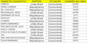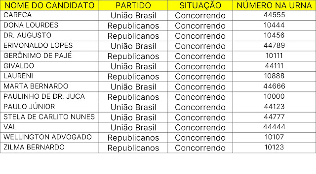 As listas de todos os candidatos estão disponíveis abaixo, com os nomes e os números de urna, os partidos e as situações de cada um (concorrendo ou inapto para concorrer).