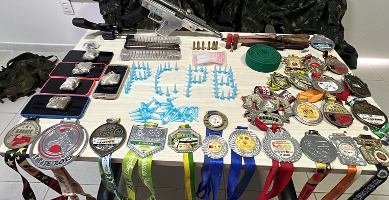 Além da atleta, um homem também foi preso durante a operação. A ação policial terminou com a apreensão de drogas, armas de fogo, além de roupas camufladas utilizadas na prática criminosa.
