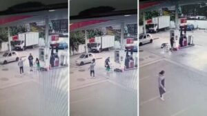 Nas imagens, é possível ver o momento em que o frentista e o homem estão discutindo. Depois, o homem saca uma arma e atira contra o frentista, que cai no chão. O homem e uma mulher fogem em seguida.