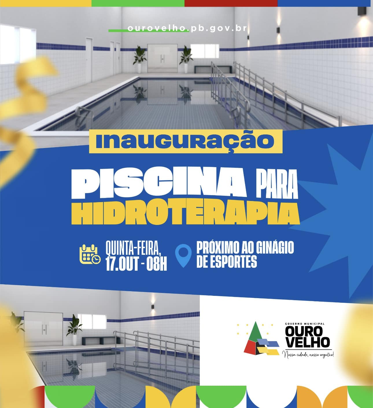 O prefeito de Ouro Velho, Dr. Augusto Valadares, e o prefeito eleito, Dr. Júnior Venâncio, inauguram nesta quinta-feira (17), a piscina de hidroterapia no centro de reabilitação. A solenidade ocorrerá às 08h da manhã, próximo ao Ginásio de Esportes.