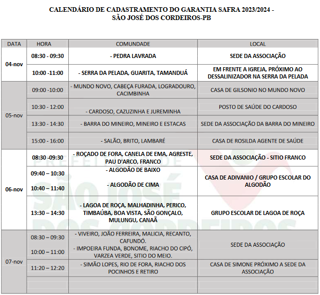 A Prefeitura de São José dos Cordeiros, por meio da Secretaria Municipal de Agricultura e Empaer, divulga o calendário do Garantia Safra 2024/2025. De acordo com informações apuradas pelo Focando Paraíba as inscrições começarão no dia 04 de novembro, a partir das 08h30, na Sede da Associação, da comunidade rural da Pedra Lavrada.