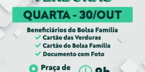 A entrega será realizada na Praça de Eventos, a partir das 9h da manhã, e é coordenada pela Secretaria de Trabalho e Ação Social. Os beneficiários do Bolsa Família deverão levar o cartão de verduras, o cartão do Bolsa Família e um documento com foto para receber os alimentos.