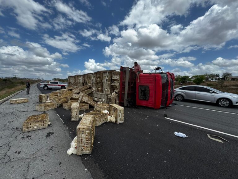 Uma carreta carregada de galinhas tombou em um trecho da BR-230, no município de Gurinhém, no Agreste paraibano. O caso aconteceu no início da tarde desta quarta-feira (6) e deixou três pessoas feridas.