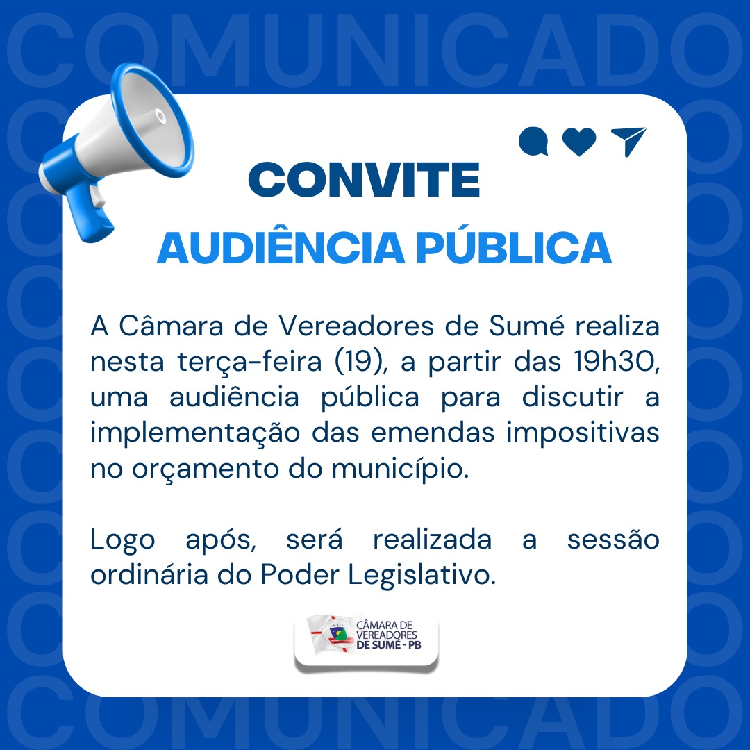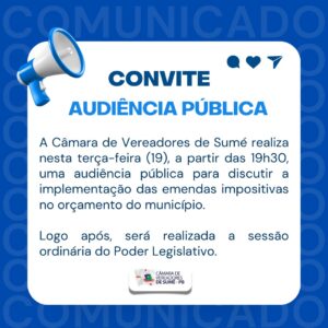 Nesta terça-feira (19), a Câmara de Vereadores de Sumé irá realizar uma audiência pública para discutir a implementação das emendas impositivas para os vereadores.