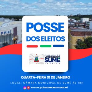 Na quarta-feira (01) de janeiro de 2025, a Câmara de Vereadores de Sumé realiza a sessão que irá empossar o prefeito eleito Manezinho Lourenço, o vice-prefeito Dr. Francisco Braz e os 11 vereadores que irão compor o Legislativo sumeense entre 2025-2028.