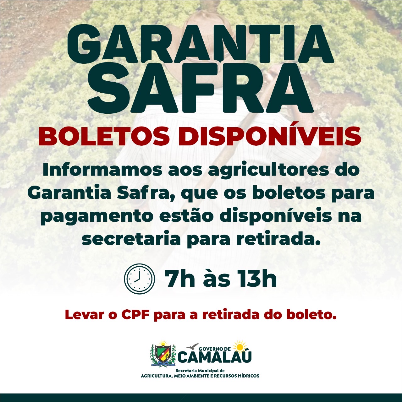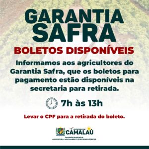 A prefeitura municipal de Camalaú, através da Secretaria Municipal de Agricultura, informa que já está realizando a entrega dos boletos do Garantia Safra, 2024/2025. Os beneficiários devem comparecer a Secretaria de Agricultura, no horário das 07h às 13h.
