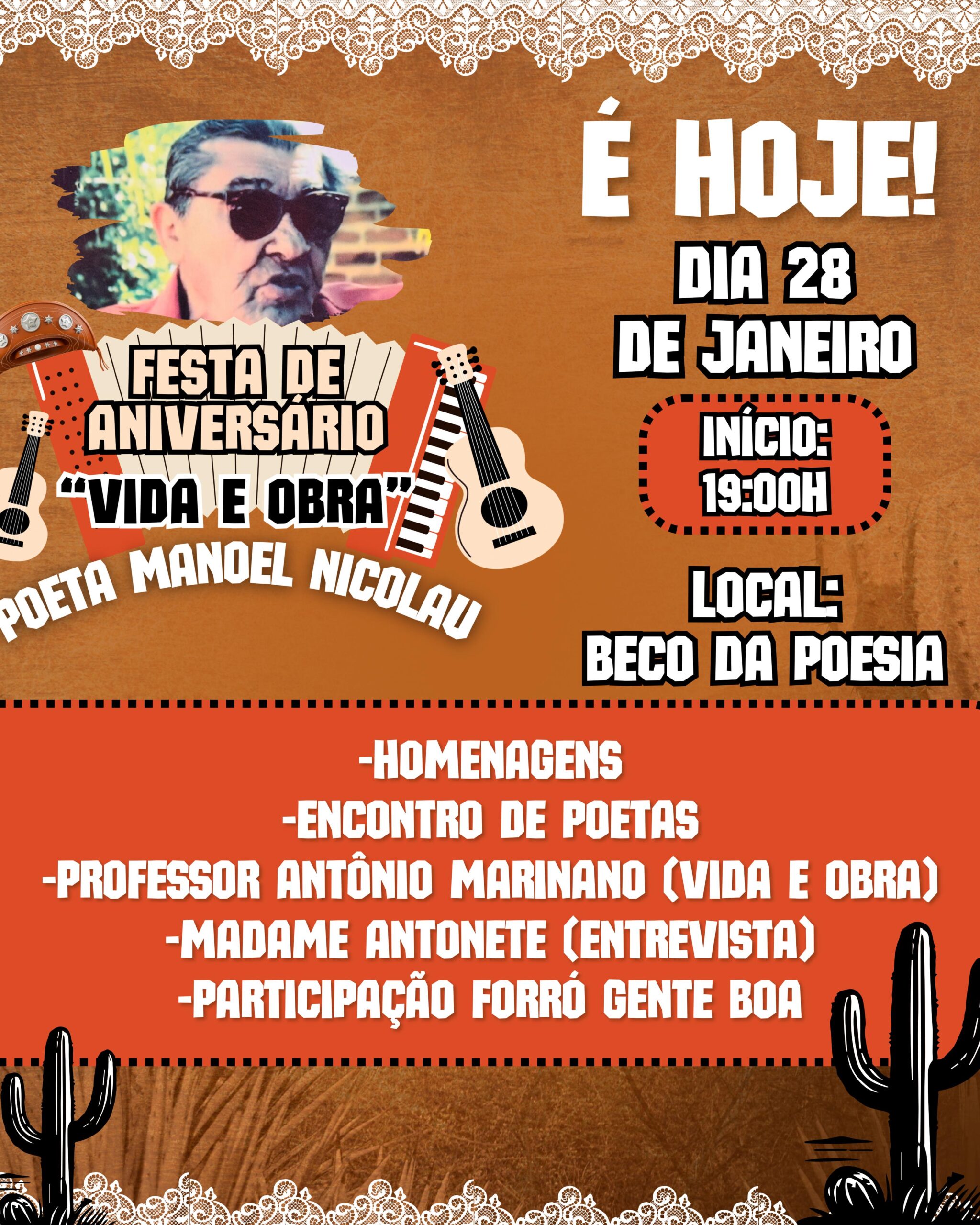 A programação contará com encontro de poetas e poetisas – cantando e declamando Manoel Nicolau, homenagens ao referido poeta com Madame Antonete, e palestra com o professor Antônio Mariano sobre vida e obra de Manoel Nicolau.