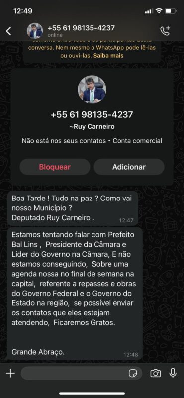 O golpista está usando um número de telefone falso e entrando em contato com os prefeitos através do WhatsApp, onde se identifica como sendo o deputado Ruy Carneiro.