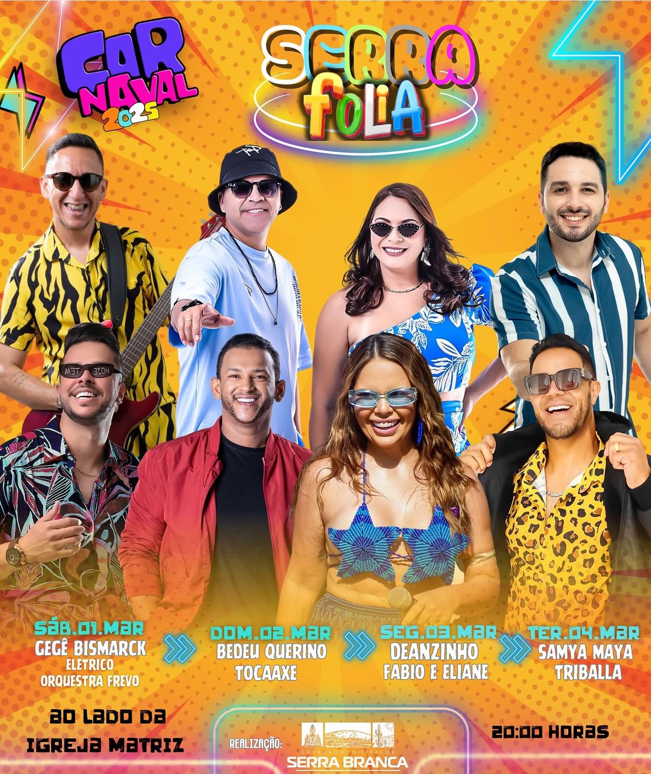 A programação tem início às 20h em todos os dias de evento. A expectativa é de que o Serra Folia 2025 seja um dos maiores carnavais da região, movimentando a economia local e trazendo turistas para celebrar essa grande festa em Serra Branca.