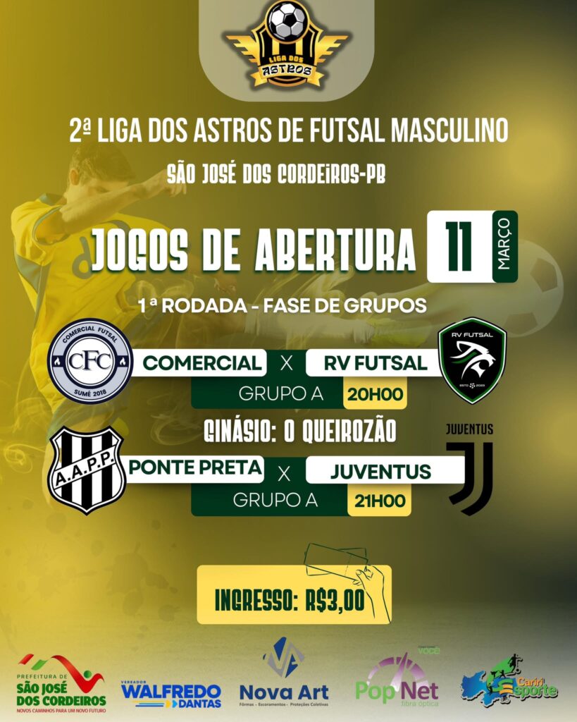 Os jogos de abertura da 2ª edição da Liga dos Astros terão início nesta terça-feira, dia 11 de março com a realização de duas grandes partidas no ginásio poliesportivo de São José dos Cordeiros.