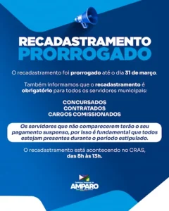 A Prefeitura de Amparo, informou nessa quinta-feira (13/02) que o recadastramento obrigatório para todos os servidores municipais foi prorrogado até o dia 31 de março.