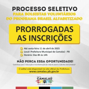 A Prefeitura Municipal de Camalaú, por meio da Secretaria Municipal de Educação, informa que as inscrições para o Processo Seletivo Simplificado de Bolsistas Voluntários do Programa Brasil Alfabetizado foram prorrogadas até o dia 11 de abril de 2025 (sexta-feira).