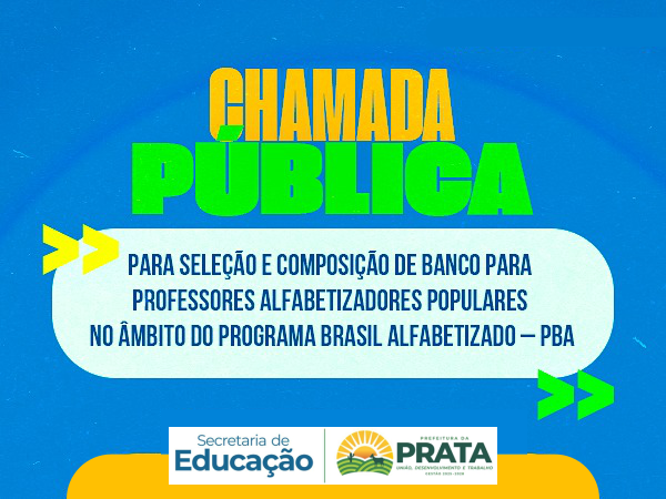 A Prefeitura Municipal de Prata-PB, por meio da Secretaria Municipal de Educação, torna pública a Chamada Pública Nº 001/2025, destinada à seleção e composição de banco de Professores Alfabetizadores Populares para atuação voluntária no Programa Brasil Alfabetizado (PBA) – Ciclo 2025.