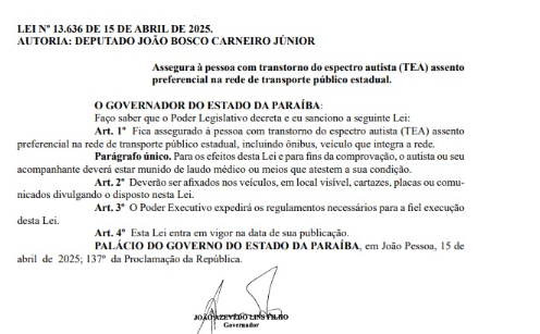 Entrou em vigor nesta quarta-feira (16) uma nova lei que garante assento preferencial a pessoas com Transtorno do Espectro Autista (TEA) na rede de transporte público estadual da Paraíba. A medida foi publicada no Diário Oficial do Estado e sancionada pelo governador João Azevêdo (PSB).