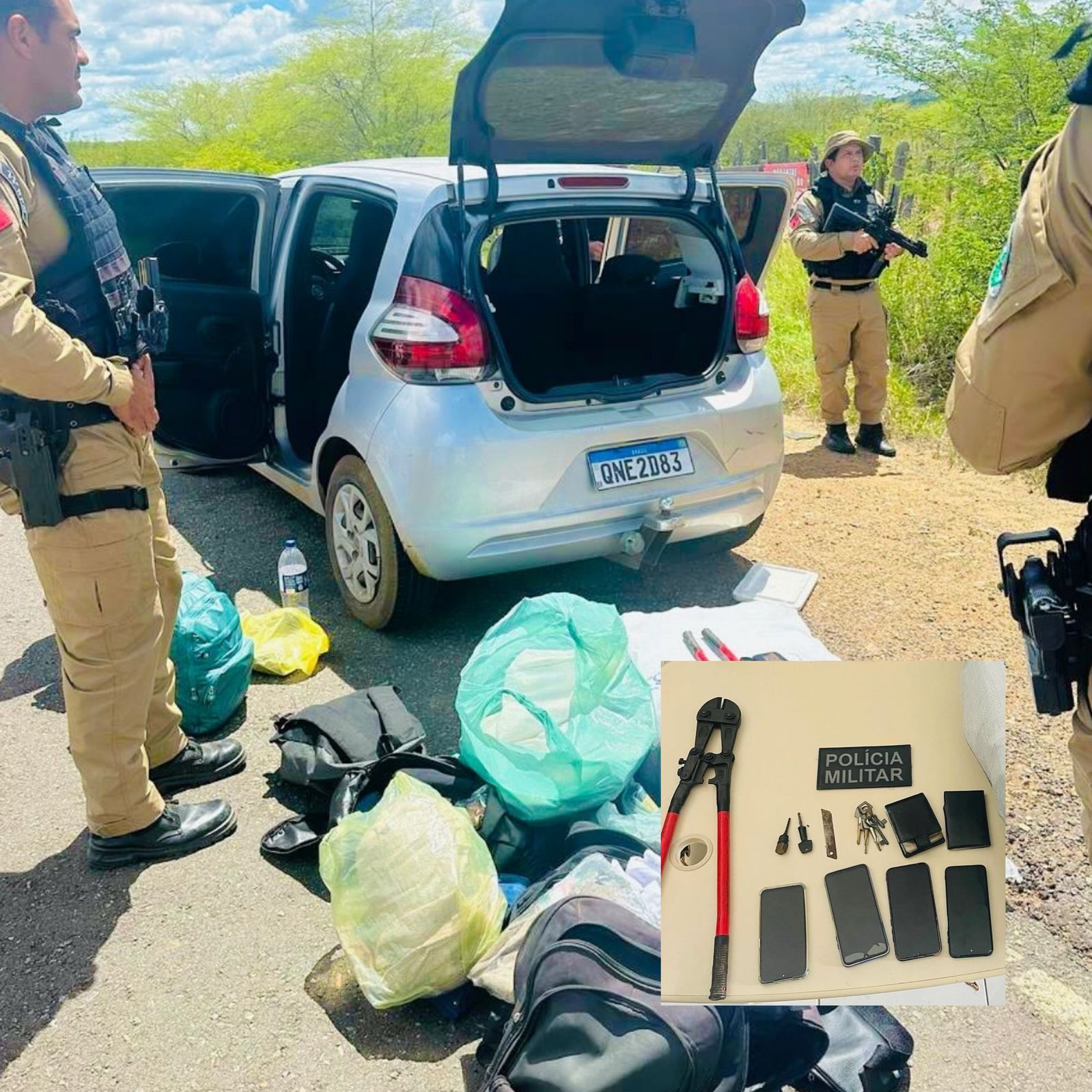 Guarnições do 11° Batalhão da PM, com atuação integrada entre os destacamentos das cidades do Congo, Camalaú e Sumé, localizaram e abordaram um Fiat Mobi de cor prata nas proximidades da cidade de Sumé. Durante a abordagem, foram encontradas diversas mercadorias provenientes do crime, além de ferramentas utilizadas para arrombamento.