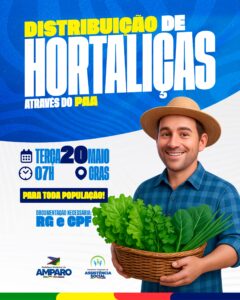 A Prefeitura de Amparo, por meio da Secretaria de Assistência Social, realizará nesta terça-feira, dia 20 de maio, mais uma edição da Distribuição de Hortaliças, uma iniciativa que visa garantir o acesso da população a alimentos frescos, nutritivos e cultivados de forma saudável.