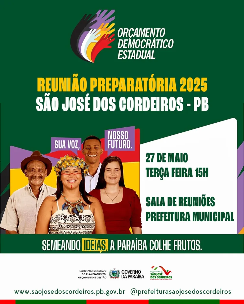 Nesta terça-feira (27/05), a Prefeitura de São José dos Cordeiros realiza uma Reunião Preparatória do Orçamento Democrático Estadual. O encontro está marcado para as 15h, na sala de reuniões da sede do Executivo Municipal.