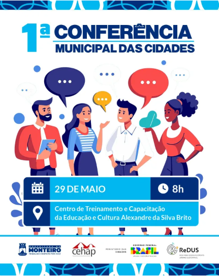 A cidade de Monteiro será sede, no dia 29 de maio, a partir das 8 horas, no Centro de Treinamento e Capacitação Educacional e de Cultura Alexandre da Silva Brito (Antigo Clube Municipal), da 1ª Conferência Municipal das Cidades.
