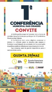 A Prefeitura de Camalaú realiza, nesta quinta-feira (29), a 1ª Conferência Municipal das Cidades. O evento acontecerá a partir das 8h, na Escola Francisco Chaves Ventura, reunindo representantes da sociedade civil, autoridades e especialistas para debater os principais desafios e soluções para o desenvolvimento urbano do município.