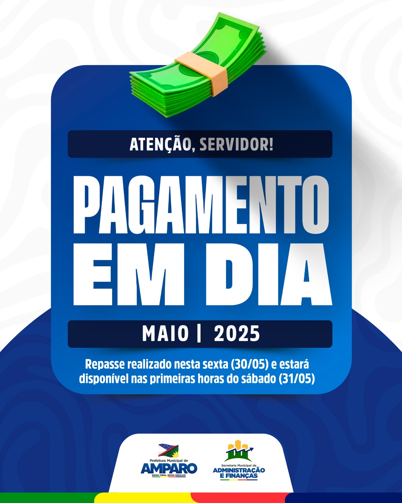 A Prefeitura de Amparo, por meio da Secretaria Municipal de Administração e Finanças, informou que o repasse salarial referente ao mês de maio de 2025 foi realizado nesta sexta-feira (30). Os valores estarão disponíveis para saque nas primeiras horas deste sábado (31).