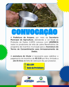 A Prefeitura Municipal de Amparo, por meio da Secretaria Municipal de Agricultura, informa que, em cumprimento à Lei Geral de Proteção de Dados (LGPD), está convocando com urgência todos os produtores de leite de cabra beneficiários do programa de incentivo municipal para assinatura do Termo de Consentimento para Armazenamento de Dados.