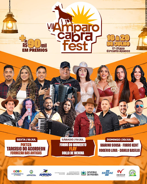 A Prefeitura de Amparo anunciou oficialmente as atrações musicais da VII edição da Amparo Cabra Fest, que será realizada de 16 a 20 de julho de 2025. Consolidada como um dos principais eventos agropecuários e culturais do Cariri Paraibano, a festa reúne criadores de toda a região, promove a economia local e oferece uma programação artística de grande porte.